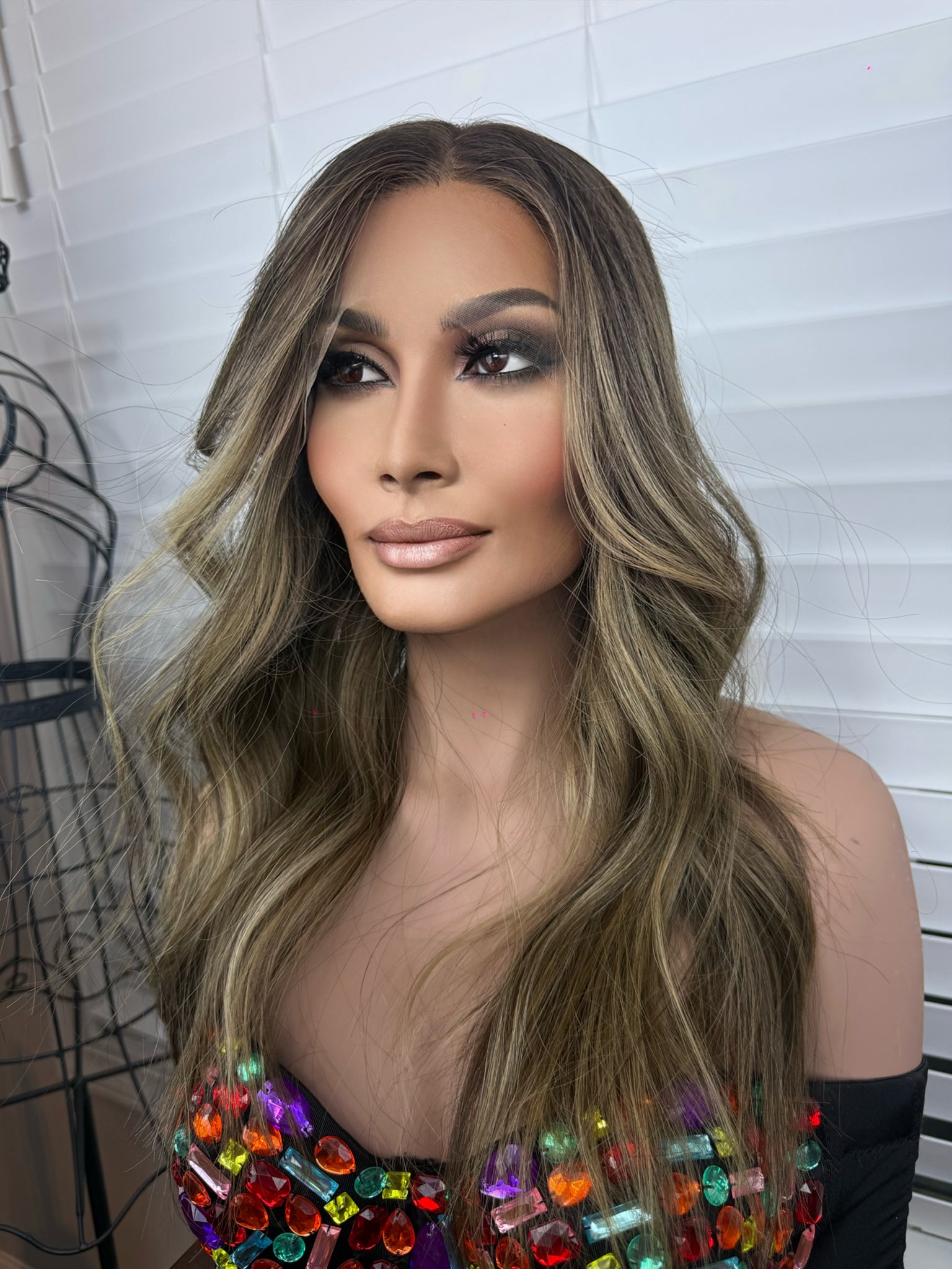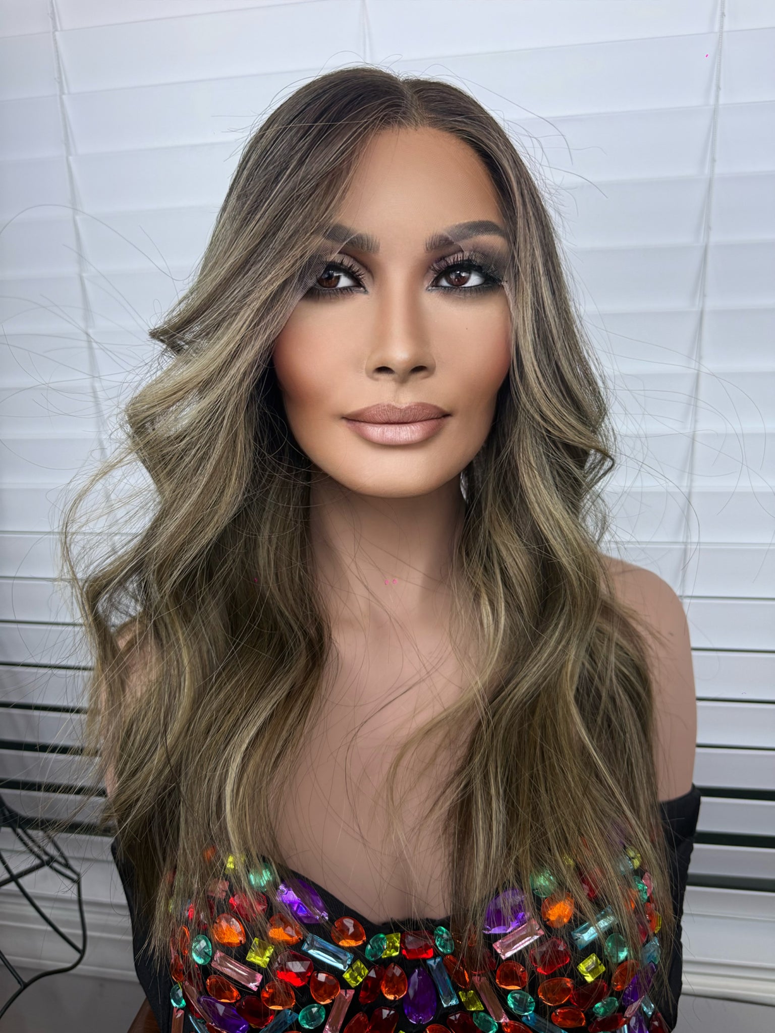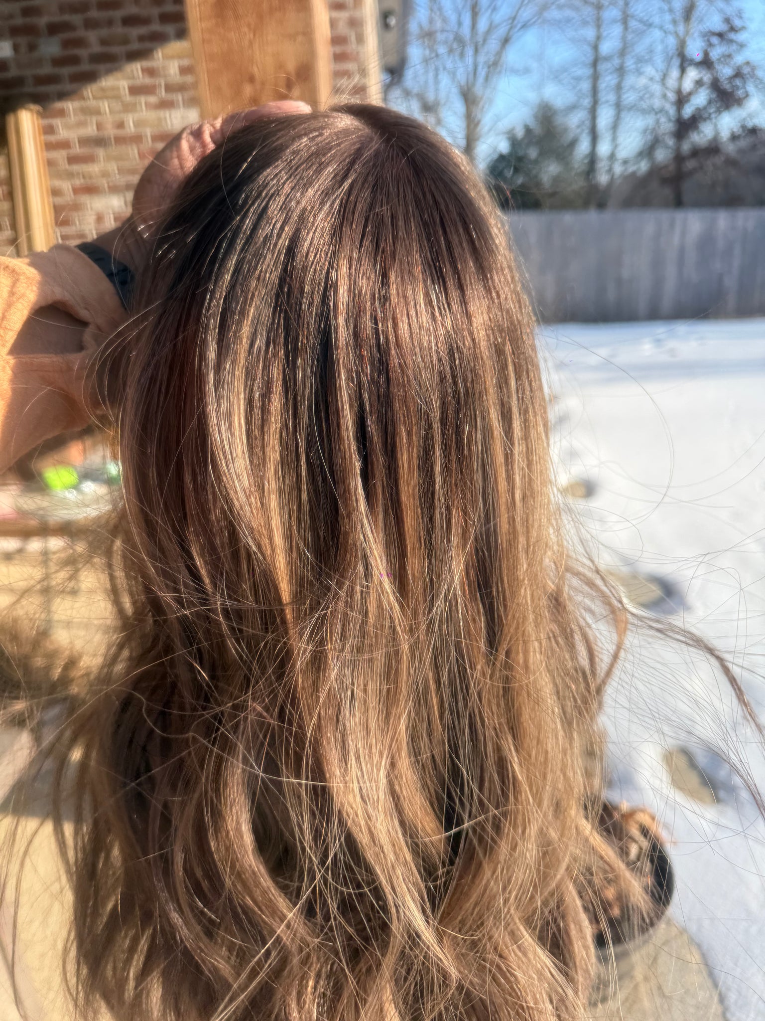 Color: Level 3 root melt , Level 4 brunette base, fading into a level 6 shaft to ends , complete with an ashy mushroom balayage. Custom colored by our master colorist.