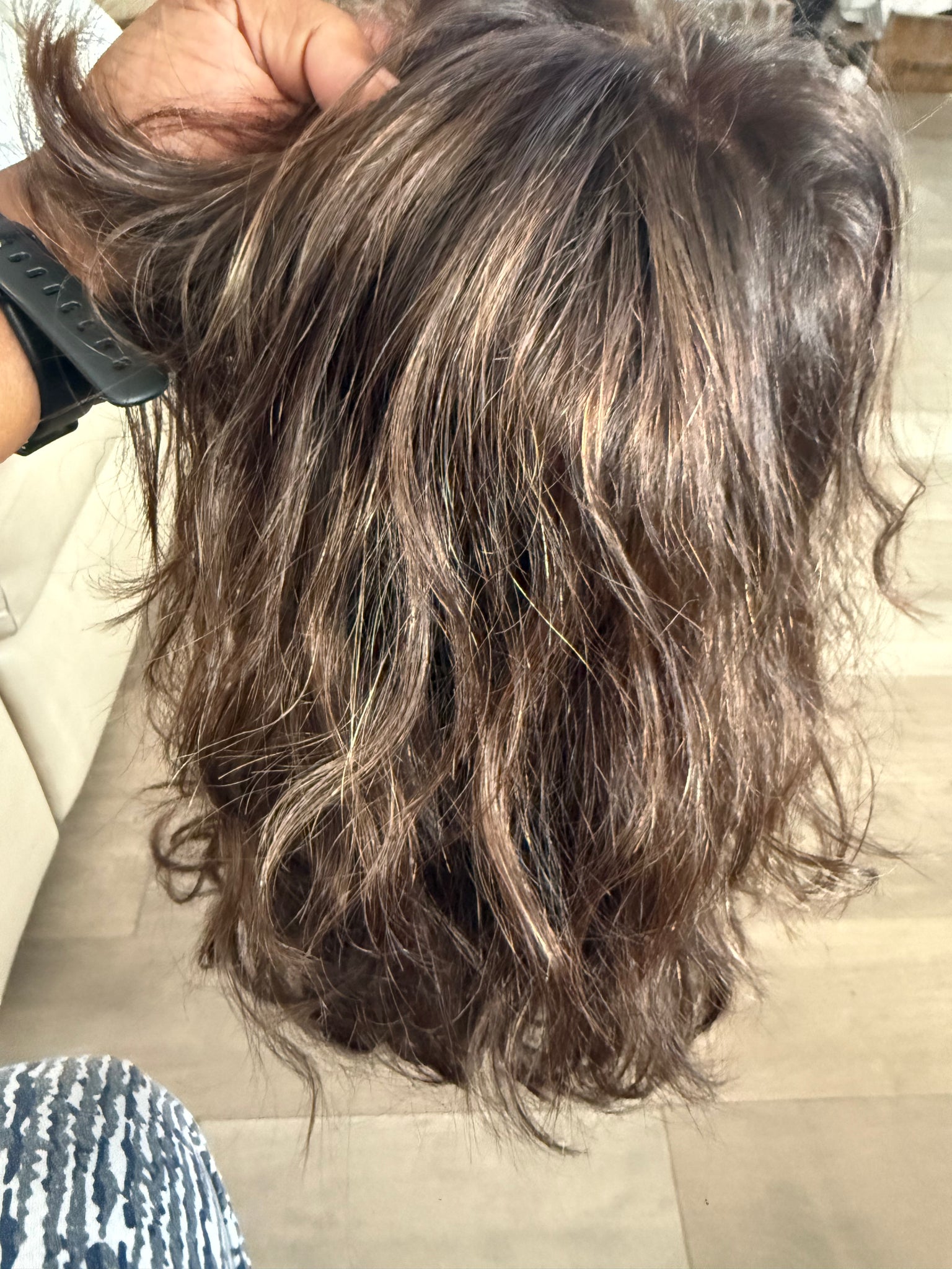 Level 3 rooted, It has an overall 3 and 4 Dark to Medium Brown color. beige thin highlights (level 8)
